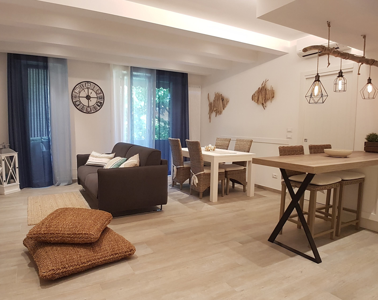 L'idea da cui sono partito nell'arredare questo appartamento era di ricreare un ambiente unico nel suo genere, con riferimenti al mare, alla spiaggia e sfruttando l'armonia dei colori e del legno di mare. L'obiettivo è trasmette fin dal primo momento in cui si entra in casa quel clima di relax e spensieratezza tipica di ogni vacanza