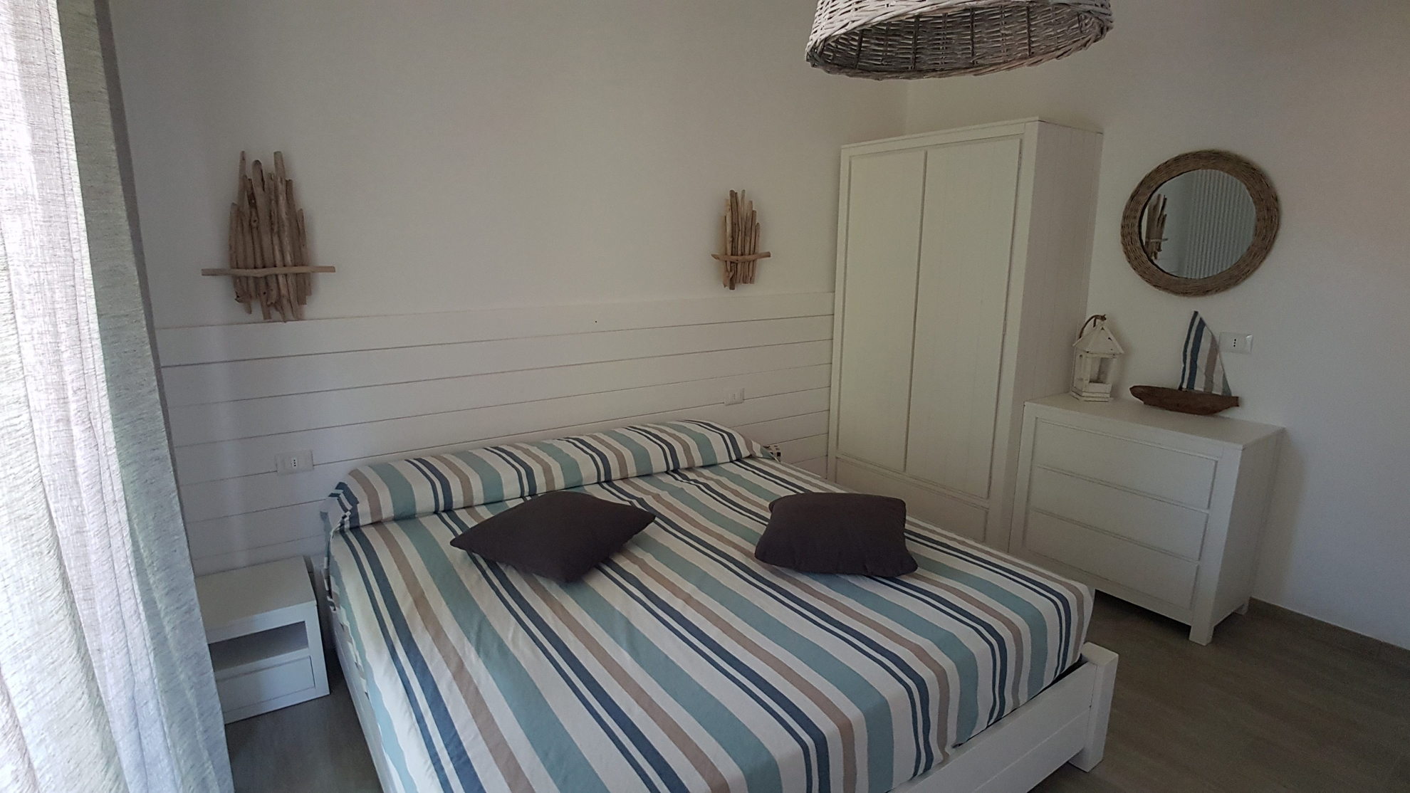 Composto da zona giorno open space, camera matrimoniale e cameretta con 2 letti singoli, bagno dotato di doccia con cromoterapia, secondo bagno di servizio, ampio balcone e garage privato. Situato in zona molto tranquilla e immersa nel verde, dista 5/10 minuti a piedi dal mare. Presenti wifi, smart tv con Netflix - Amazon Prime, aria condizionata, microonde, piano cottura a induzione, phone, biciclette.